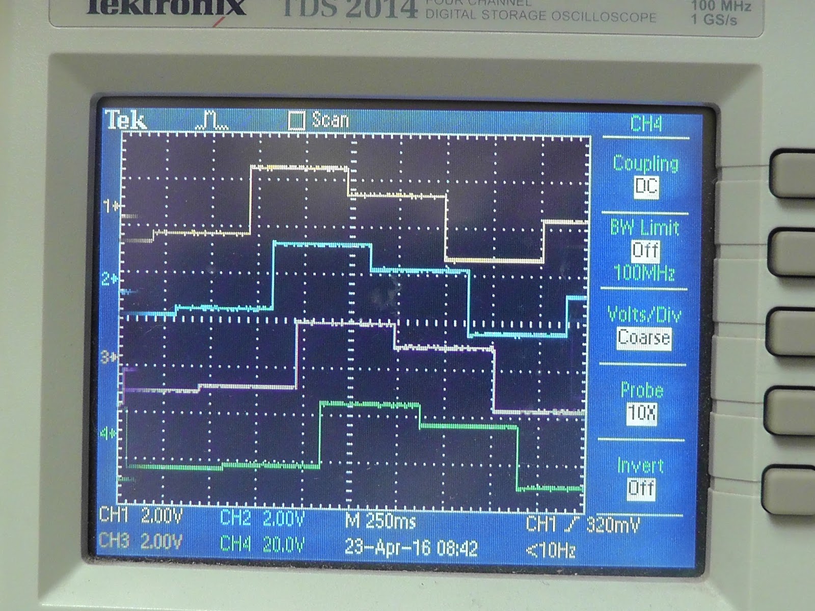 These two pictures show the 4 outputs as a tri-wave is sampled and shifted thru: