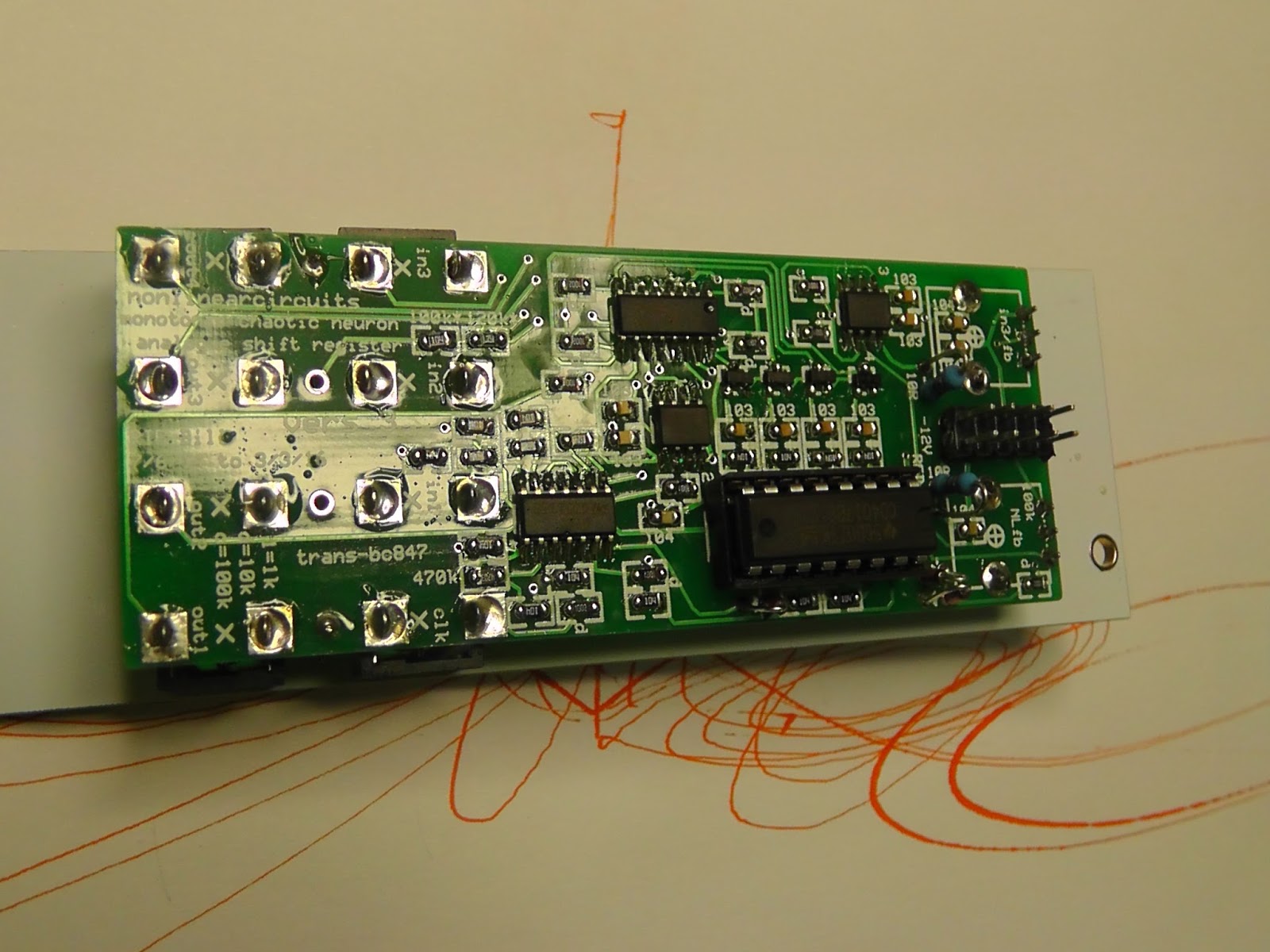 Basically it is a four stage analog shift register with two feedback paths, one nonlinear and one linear (I do try to walk the line). If you turn the feedback paths down to zero, you get a regular ASR. Turn up the feedback to get more complex and staggered patterns from the 4 CV outputs. It will happily run at audio rates as well.