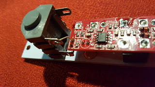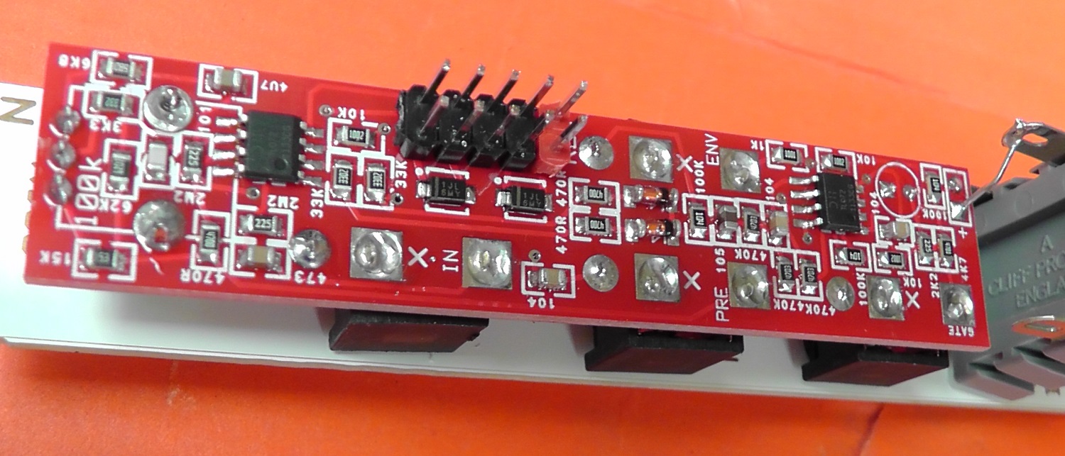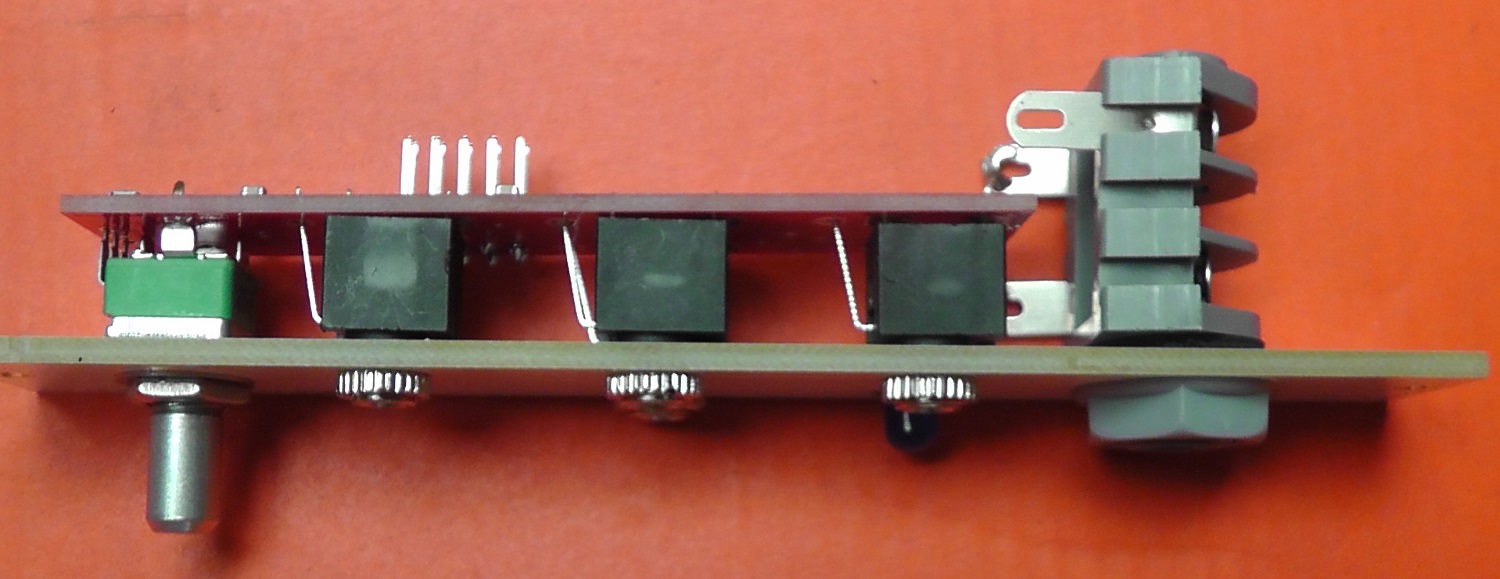 The 1/4" jack connects to the switch of the 3.5mm input jack, the outputs are pre-amp (20x gain), envelope and gate. The LED indicates when the gate is on.
