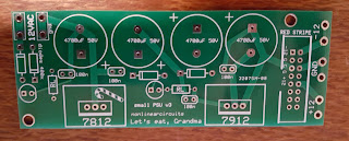 Anyway, its about a simple PSU as you can get. Runs on 7812 and 7912 to give +/-12V. If you bolt them to a nice big heatsink, you could even get 1A per rail (using 1.5A spec'd regulators).