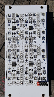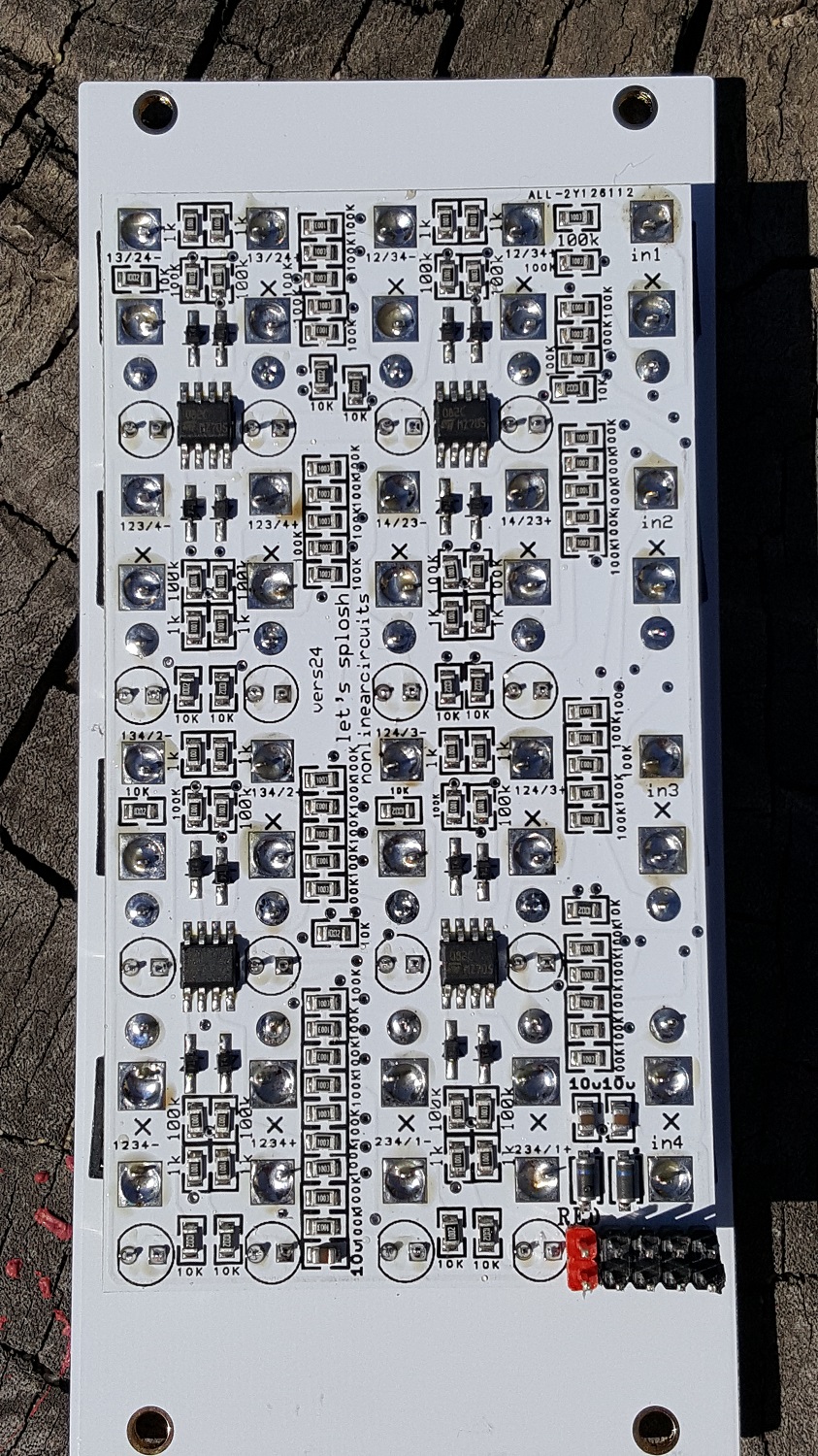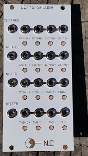 This is 8 different rectifiers processing 4 input signals. It is happy to work with audio or CV or both at the same time. It has 16 outputs that will deliver 16 different signals made up of components of the 4 incoming signals. To put it simply, it makes a gloopy mess of the incoming signals and smears it all over your patch. If this module name and the food names make no sense look up some sploshing videos on youtube. That is pretty much what this module will do to your CV and audio signals with corresponding amounts of pleasure for the receiver.